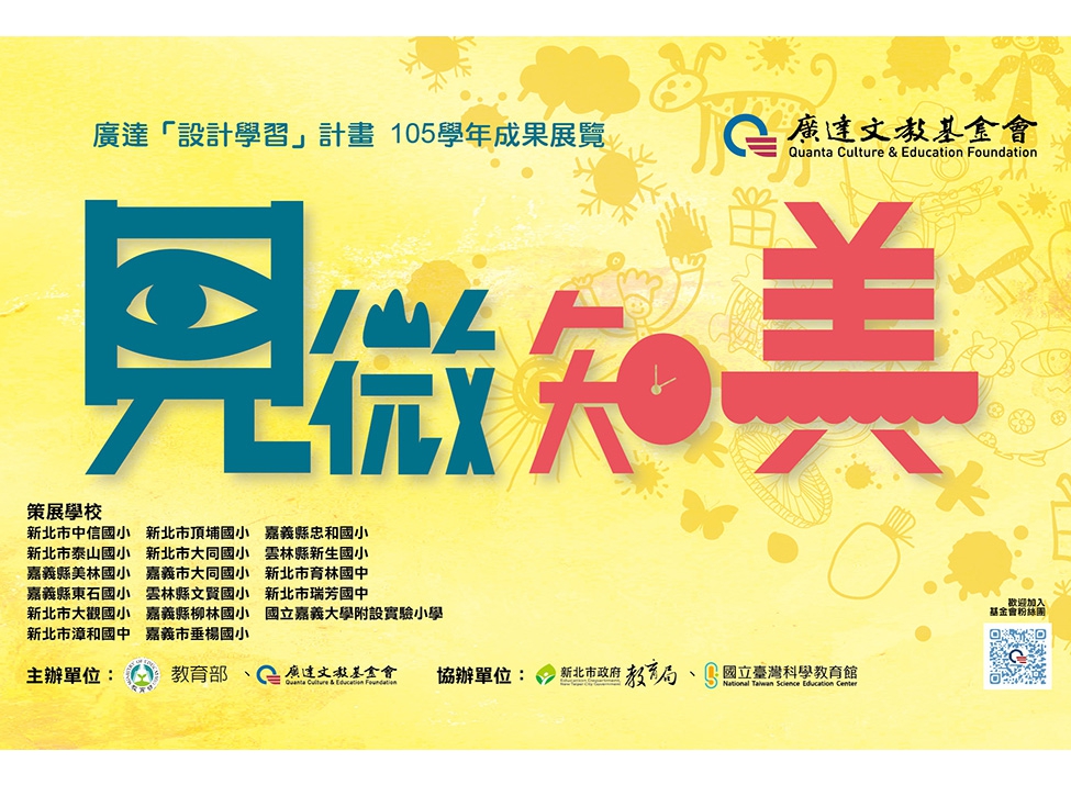 英國詩人William Blake的作品《天真之歌》:「一沙一世界,一花一天堂,掌中握無限,剎那即永恆。」從一顆細小的砂粒或一朵花裡,都能見到巨大的世界、想像的天堂。所以,微乎?巨乎?關乎一心而已,在其中所觀察到能感動人心的事物,都能夠帶給我們全新的視野與感受,開闊我們的眼界與心靈。 105學年度廣達「設計學習」計畫,以「見微知美」為年度主題,甄選17所學校從六種微觀角度進行策展任務設計:展區一「微眼觀序」-從觀察昆蟲生態來發現秩序的美;展區二「微景知續」-從觀察校園中的景色來守護永續的美;展區三「微行承諾」-從參與課程的行動方案來展現傳承的美;展區四「微物轉生」-從探討地方物產認識在地生活之美;展區五「微行‧行久」-從發現課程的關鍵轉動來持續深化美;展區六「微行‧行樂」-從感受課程的關鍵轉動來持續展現美。 17所學校的策展歷程,展現策展小尖兵拋開對事物表象的認識,以好奇之心、異象之眼,運用其多元感官、心靈、想像與外界互動、溝通,培養其敏銳感知能力的身心在生活周遭探索、發現美的策展歷程,累積美感素養的基礎能力。