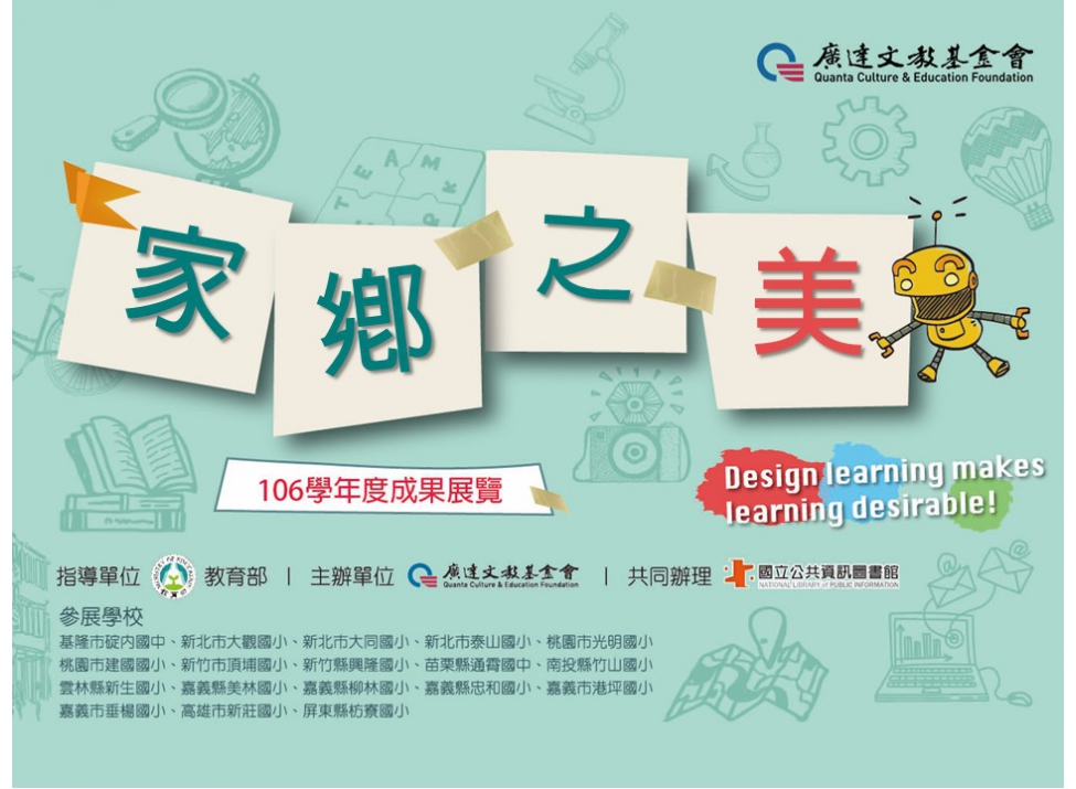 106學年度廣達「設計學習」計畫,以「家鄉之美」為年度任務主題,參與本計畫的18所學校,由在地的角度出發,融入校園議題,發掘家鄉在地的人文、社會、自然…等區域特色,用學校力量來讓「家鄉之美」被看見。本展覽透過三大展區,展現各校師生與家鄉的對話故事。展區一「生活之美」-以生命力與生活力傳達在地生活之美;展區二「傳承之美」-以老物件、共同記憶述說在地傳承之美;展區三「轉化之美」-以新手法、新觀點展現在地轉化之美。